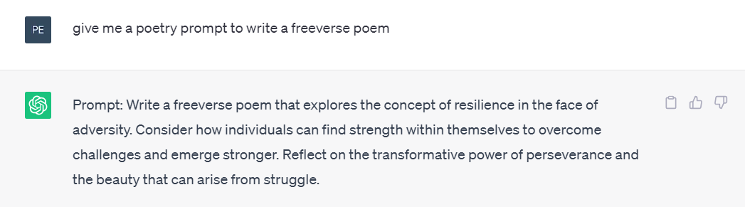 Okay but I wanted to try a fun writing exercise and I logged into ChatGPT. Here's a poetry prompt I was given: